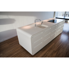 Corian® peut être découpé, thermoformé, incrusté, poncé et même imprimé par sublimation pour s’adapter à toute création spéciale. C’est un matériau particulièrement adapté à la rénovation, car il peut être directement collé sur un ancien plan de travail.