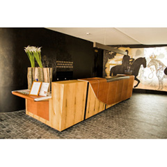 L'accueil de l'Hôtel nous plonge dans une atmosphère chaleureuse, au coeur d'un univers équestre qui se retrouve notamment dans le choix des matériaux. Corian®, Cuir, bois massif, métal et verre composent cet accueil authentique. Les sièges bas en bois massif habillés de cuir ont été créés spécialement pour les Haras. La réalisation de l'ensemble du mobilier de cet accueil et de l'espace petit déjeuner montre notre savoir faire et notre maîtrise des différents matériaux.