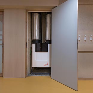 Pour répondre aux contraintes architecturales et thermiques du projet, le choix du bureau d’études Atmosphères s’est porté sur les unités de ventilation double flux haut rendement décentralisées Zehnder ComfoAir Q 600 qui limitent la longueur et le diamètre des réseaux et offrent une récupération de chaleur de 97% (certifiée NF).