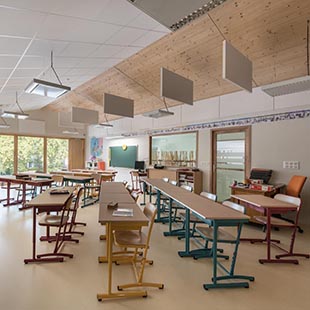 Installées à raison d’une machine par classe, elles maintiennent un air pur à 20° C en milieu occupé. Ce sont des batteries électriques implantées sur le réseau de ventilation, au départ de chaque soufflage des VMC, qui assurent le complément de chauffage nécessaire au confort des élèves et des enseignants.