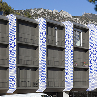 - Enduit sur isolant en partie courante, avec intégration ponctuelle de touches colorées sous la forme de panneaux en verre émaillé,
