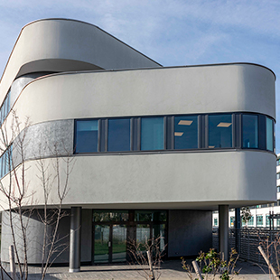 Habillé du bardage ventilé StoVentec R Enduits qui épouse ses courbes, le siège lyonnais du syndicat Allizé Plasturgie arbore une peau en enduit lisse et un revêtement décoratif à effets métalliques.