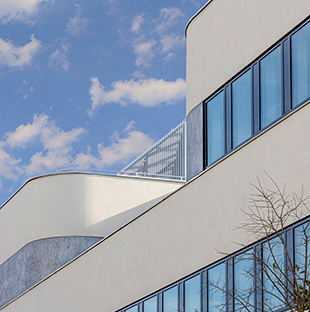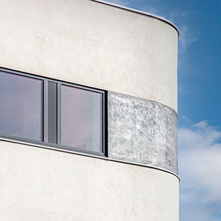L’enduit de finition Stolit MP blanc taloché feutré et le revêtement décoratif StoColor Metallic parachèvent la façade en offrant une surface lisse et des reflets métallisés jouant ainsi avec la lumière ambiante.