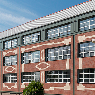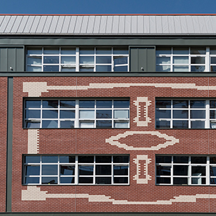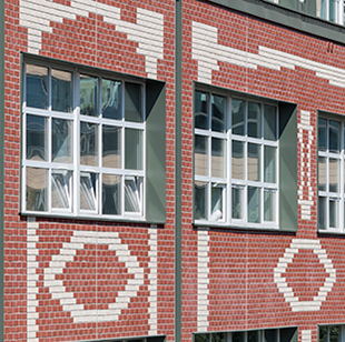 Le calepinage des briques sable et rouge orangé est différent sur les deux façades. Fidèle à l’original côté cour, il a été réinterprété par les architectes côté rue car la façade avait subi de nombreuses modifications depuis son origine. Des bandes d’aluminium laquées grises viennent s’intercaler entre les panneaux de bardage pour reconstituer l’aspect de la structure métallique d’origine. Fixées sur les poutres epsilon par leur propre ossature, elles sont ornées de cabochons en aluminium imitant les rivets style Eiffel.