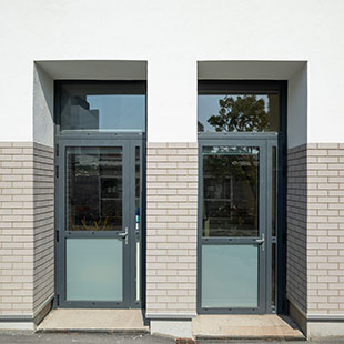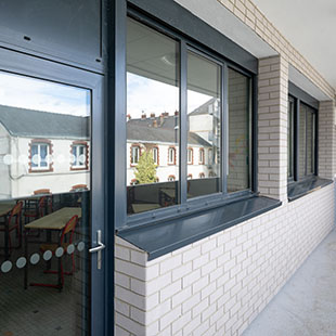 Quant au rez-de-chaussée, particulièrement exposé aux chocs dans une cour d’école, il sera revêtu sur 1,80 m de hauteur de briquettes en résine polymère de couleur grise. Moins épaisses que les briquettes en terre cuite, celles-ci présentent un aspect de brique naturelle mais se montrent moins douloureuses pour les enfants en cas de choc frontal, tout en résistant mieux aux sollicitations mécaniques. |
