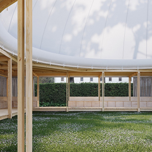 Il s’agit d’une construction ouverte, constituée d’une structure de bois faisant office d’agora, et où les colonnes de bois se succèdent pour former un carré de 17 mètres de côté. Sur cette structure, repose une coupole gonflable autoportante et surpressurisée de 6 mètres de hauteur, confectionnée à l’aide de deux membranes composites du Groupe Serge Ferrari.
