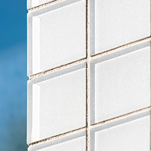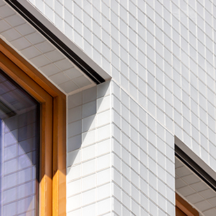 Dès la conception du bâtiment les architectes ont opté pour une façade en bardage ventilé sur panneaux StoVentec SCM qui s’imposait comme la meilleure solution sur une construction à ossature bois. Le parement devait être réalisé en mosaïque de pâte de verre. Après avoir comparé différents produits, le choix des architectes s’est porté sur le produit StoGlass Mosaic, une mosaïque de verre conçue pour être appliquée sur le système StoVentec SCM revêtements collés. Les éléments de verre de 5 x 5 cm sont de couleur blanche.