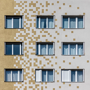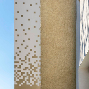 Reanova préconise le revêtement auto-nettoyant StoLotusan pour finition. « Un atout non négligeable à proximité du boulevard périphérique », note Hélène Prouzeau, architecte-ingénieur de Reanova en charge du projet. Mais un revêtement blanc cassé ne suffit pas à redonner vie à ces bâtiments monolithiques, sans balcons, à la volumétrie élémentaire. « Très voyant dans le quartier, l’ensemble doit compenser sa pauvreté architecturale par un apport de matière, de couleur », décident les architectes. Afin de donner une image contemporaine à cette page blanche, ils proposent de peindre des motifs dorés qui jouent avec la lumière. Sur le pignon du bâtiment R+5 bien visible depuis la fourche lorsqu’on arrive de Paris, un jeu de lignes droites obliques entrecroisées évoque un jeu de mikado et le croisement des rues alentour. Des aplats dorés soulignent par ailleurs la cage d’escalier et deux colonnes de fenêtres. Le bâtiment R+8 est animé d’un autre motif : les aplats dorés se prolongent en une multitude de pixels carrés. Hélène Prouzeau évoque un bloc qui viendrait exploser sur la façade pour produire une avalanche de cubes.