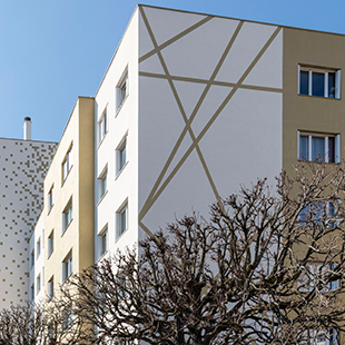 Une copropriété gagne en efficacité énergétique grâce à une isolation par l’extérieur StoTherm Mineral, mais aussi en esthétique avec l’enduit de finition auto-nettoyant StoLotusan et des motifs réalisés en peinture StoColor Metallic.