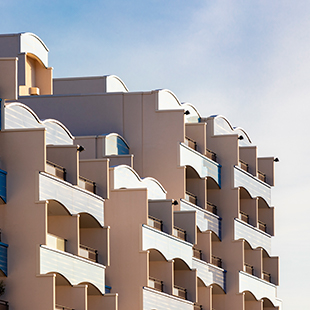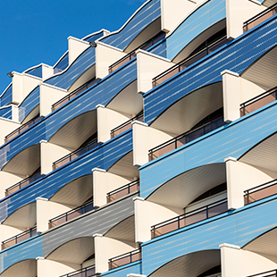 En front de mer du Touquet, « Le Président » est l’une des résidences phares de la station balnéaire du Pas-de-Calais. Le bâtiment s’étire sur 216 m de long et abrite quatorze cages d‘escaliers de R+5 à R+8. Construit en 1977, l’immeuble est à l’origine paré d’une mosaïque de pâte de verre bleue sur l’ensemble des garde-corps de balcons et certaines autres parties de la façade. En 1993, la façade soumise aux assauts du climat est rénovée. La mosaïque est recouverte de pierre de Bourgogne agrafée sur des rails métalliques. Mais la pierre ne résiste pas aux embruns et s’effrite. Une consultation est lancée auprès de quelques équipes de maîtrise d’œuvre pour élaborer un nouveau projet. « Mais au Touquet, on ne fait pas ce qu’on veut », prévient Marie Grandidier, responsable du service copropriété de Sergic. En effet, l’avis de l’Architecte des Bâtiments de France (ABF) est requis pour toute modification de façade. Il s’accorde avec le conseil syndical sur le choix du matériau verre - mais pas de teinte unie - et sur la fixation sur rails.