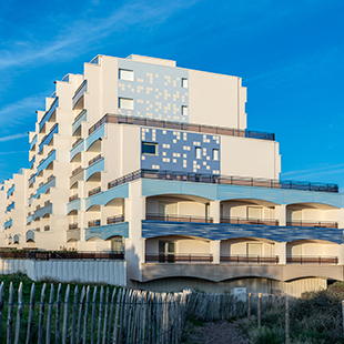 Les balcons d’une copropriété du Touquet (62), exposés aux embruns, sont habillés de bardage en verre StoVentec Glass aux motifs de pixels sur mesure tandis que ses pignons sont revêtus d’une ITE StoTherm Mineral et d’autres parties de la façade d’un enduit de finition en ravalement technique.