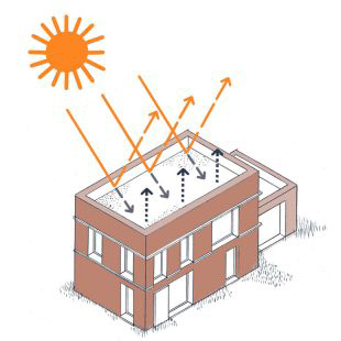 La présence de membranes bitumineuses noires augmente cet effet de surchauffe. Nos toits, fortement exposés aux rayons du soleil, ont un rôle décisif à jouer. Plus le toit d’un bâtiment réfléchit les rayonnements solaires, plus la quantité de chaleur transmise à l’intérieur est diminuée. Ce pouvoir est notamment mesuré par le Solar Reflectance Index (SRI). En toitures, l’objectif est de transformer les surfaces noires en surfaces blanches, à fort SRI. Ainsi transformées en blanc, les toitures sombres, brûlantes en été, absorbent moins de chaleur.