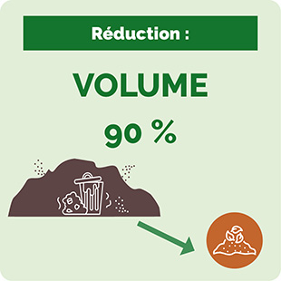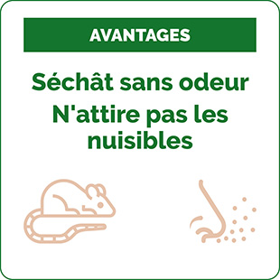 - Avantages QVT : La matière obtenue après déshydratation (séchât) est inodore et sans germes, elle n'attire pas les nuisibles. La manipulation par les opérateurs est améliorée (poids et nature du séchât) ainsi que leurs conditions de travail.
