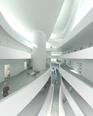 Il est important de donner une harmonie à l’ensemble, ainsi le bâtiment propose un grand vide sur sa hauteur qui met en perspective chaque niveau, et donne l’unité et l’idée de maison commune à la mairie. Passée l’entrée, on se retrouve dans un grand hall (contrôlé par l’accueil) lieu de convivialité, d’exposition, de rencontre. Comme le programme le demande, les espaces d’accueil à la population sont regroupés aux deux premiers niveaux, limitant les déplacements à l’intérieur du bâtiment.