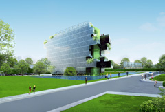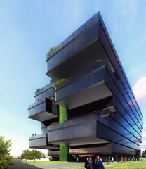 Sa façade noire-anthracite (vitrage teinté, habillage de nez de dalle) donne unité et élégance à l’ensemble. Le contraste esthétique des escaliers extérieurs créé par les parties vitrées vert pâle se prolonge la nuit grâce à leur rétro-éclairage. Il témoigne d’une profonde réflexion architecturale et lui apporte un caractère unique.