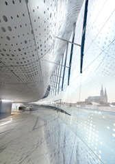 Par son effet "coup de théâtre", ses courbes dynamiques, sa grande façade ouverte sur la cathédrale, son esplanade et sa toiture-jardin en belvédère, ce nouveau bâtiment devient le vecteur identitaire du nouveau quartier.