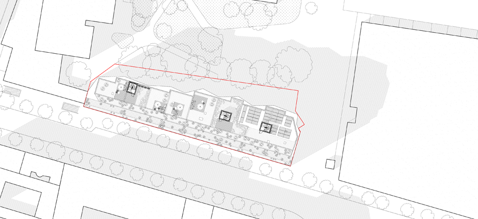 Le bâtiment travaille la profondeur de sa façade. La grille devient le support d’une biodiversité urbaine: des arbres en pot colonisent les façades, créent de l’ombre, et s’imposent en toiture. La toiture est partagée entre un usage collectifs et les terrasses privatives des logements du dernier niveau.