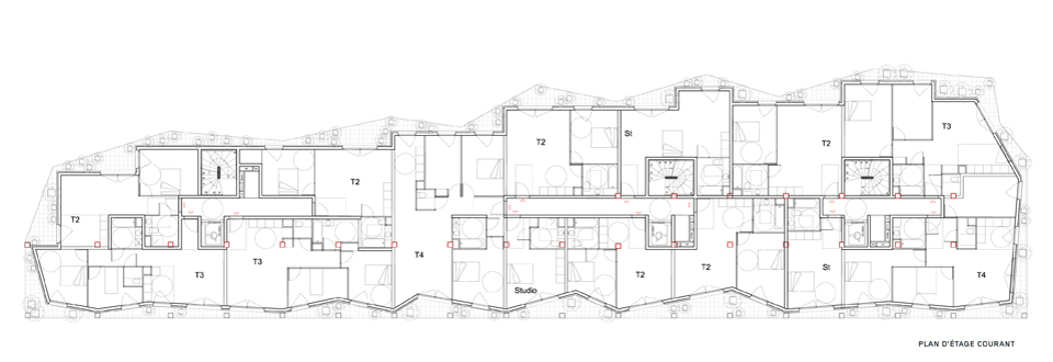 La façade Sud montre à voir une grille régulière provenant de cette logique structurelle nécessaire à la conservation de l’existant. Derrière, la façade close couverte ondule et donne différentes orientations aux logements.