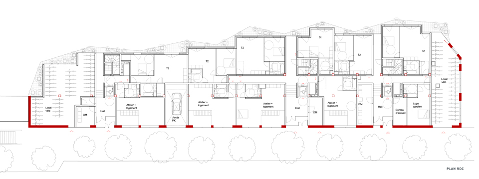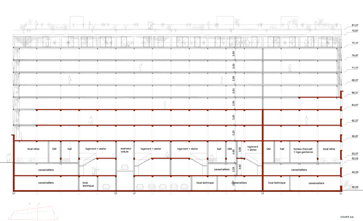 - le rez-de-ville, interface entre le bâtiment et la ville, accueille des typologies «atypiques» de logements / ateliers. La préexistence du bâtiment ne permettant pas de développer un rez-de-chaussée de plein pied, ces typologies vont permettre de l’animer. Une trémie permet d’ouvrir un espace en double hauteur au -1 propice à des usages alternatifs (studio de musique, salle d’exposition...).
