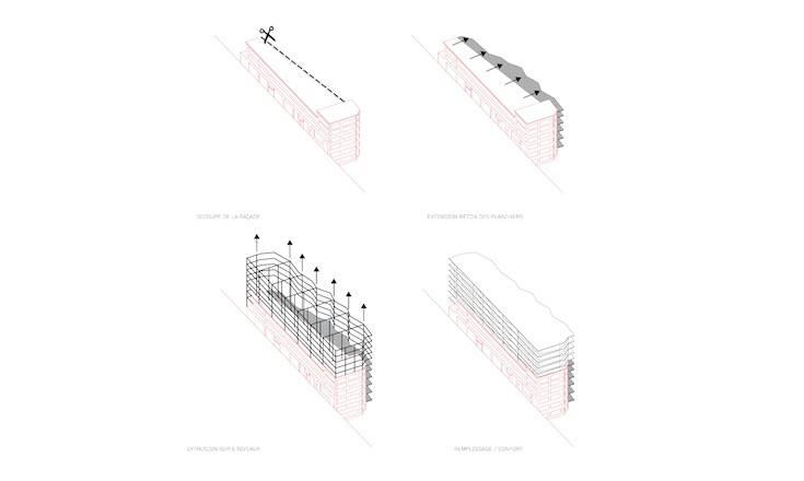 Le projet s’élève au dessus du bâtiment existant comme une extrusion de la structure initiale. Tramée et ouverte, elle contraste avec la base en brique rouge. La structure existante est conservée, seule la façade arrière (nord) est déposée, afin d’épaissir le bâtiment.