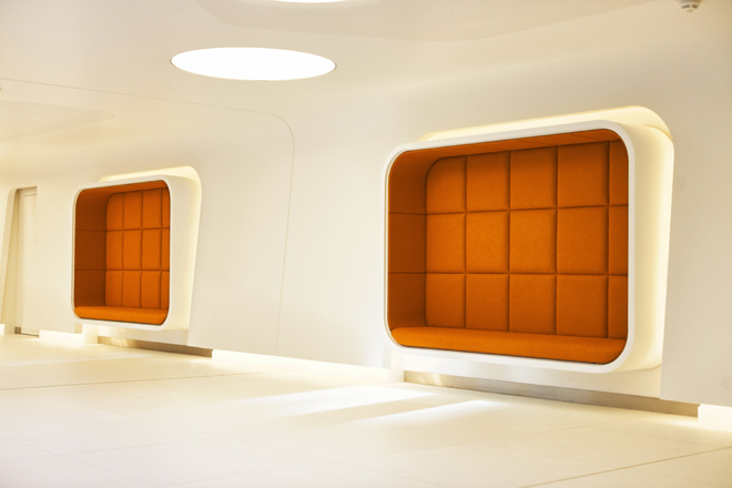 L'inclinaison et les courbures de la Feuille sont destinées à tourner le regard vers l'extérieur et à dilater l'espace là où les hauteurs sous plafonds sont moins satisfaisantes.