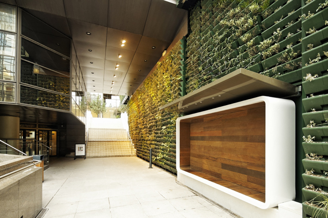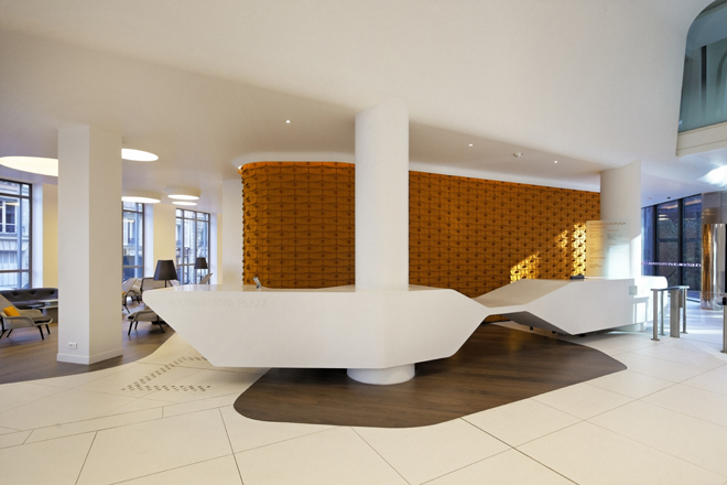 Nous avons imaginé et conçu les nouvelles façades d'accès intégrant les chevrons, stylisation du W de "Washington", la banque d'accueil Friedland, voulue comme un arrêt sur image d'un objet en mouvement à l'échelle du lieu, la Conciergerie, espace de service aux utilisateurs, les alcôves, véritables cocons de tranquillité, les "îlots" lounge disséminés le long du parcours et habillés de tuiles de feutrine orange, les abris fumeurs, objets miroir des alcôves intérieures. Nous avons entièrement repensé et conçu la signalétique intégrant une nouvelle charte graphique du lieu, sélectionné et distribué le mobilier de manière à offrir différents modes d'utilisation. Nous avons également conçu l'architecture intérieure du nouveau café contemporain, programmé par CERES conseil en restauration et réalisé sous la direction de Conceptions Nouvelles.