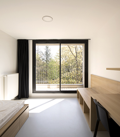 Les chambres simples sont constituées d’un espace de vie de 16.5m² et d’une loggia de 1m de profondeur. Les chambres PMR occupent deux trames et sont aménageables aussi bien en tant que T1 que de T2. Un système de cloison amovible permet en effet de séparer la chambre du salon.