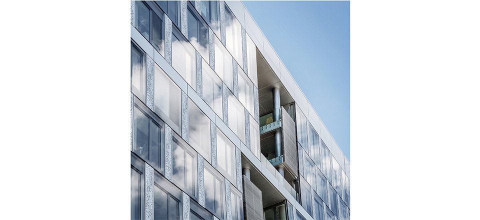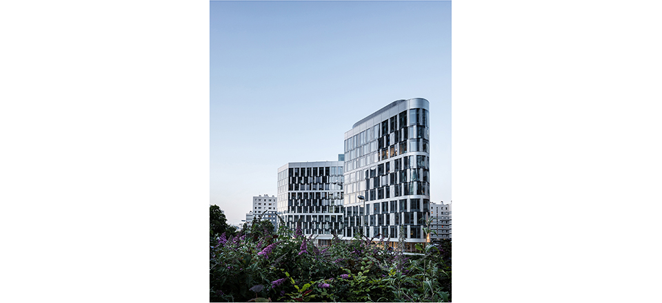 La façade du RDC est mise en retrait pour faire réapparaitre la structure porteuse et identifier un volume « soulevé », le corps du bâtiment. Nous avons choisi de structurer ce corps selon un ordre horizontal explicite qui le décompose en trois strates superposées de 3 niveaux. Cet ordre supprime la perception d’un empilement sans fin de niveau, le bâtiment change d’échelle.