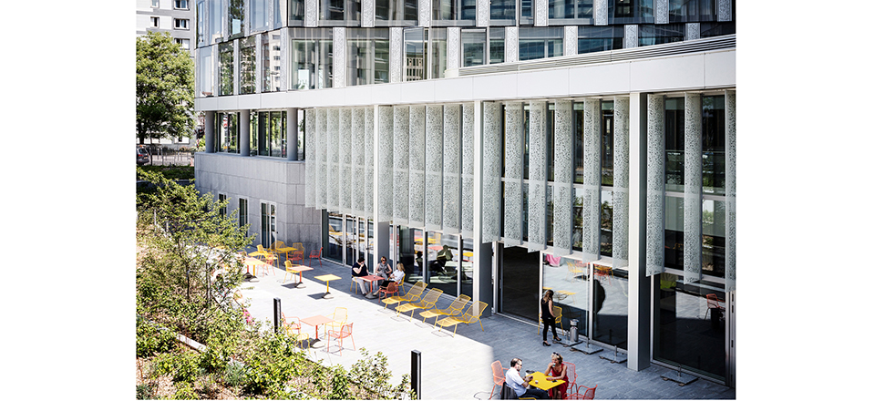 Dans le même objectif d’urbanité, les espaces « verts » sont remaniés pour être perceptibles depuis la rue. Leurs usages sont redéfinis. Au Nord, ils accompagnent la dilatation de l’entrée vers le niveau R-1 où le pôle de réunion, la cafétéria et sa terrasse sont positionnés. À Est, un travail fin sur la topographie permet de remettre pratiquement de plain-pied, la parcelle et le boulevard Circulaire. La façade Est n’est plus une façade arrière, elle entretient de nouveau, des relations fonctionnelles, urbaines, avec un boulevard Circulaire en pleine mutation.