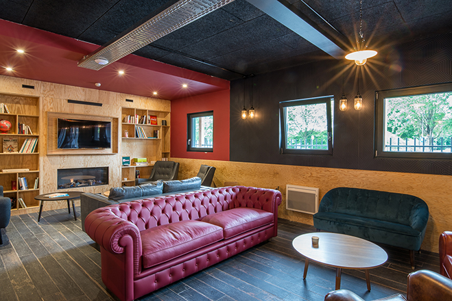 Pour le design intérieur, le studio Janréji apporte un regard disruptif et créé des espaces de convivialité intergénérationnels "comme à la maison". Tout a été pensé pour simplifier la vie des voyageurs : cuisine collaborative, comptoir-bar, moments de plaisir autour d’une partie de babyfoot ou d’un bon livre, terrasse verdoyante et son Barbapizz’, terrain de pétanque, bornes de recharge pour voitures électriques et accueil 24h/24.
