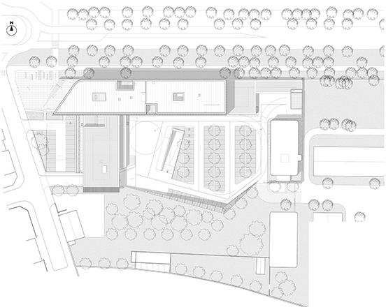 Au sud, la clôture se retourne en toiture pour composer une forme sculptée protégeant la cour de service des jets de projectiles.