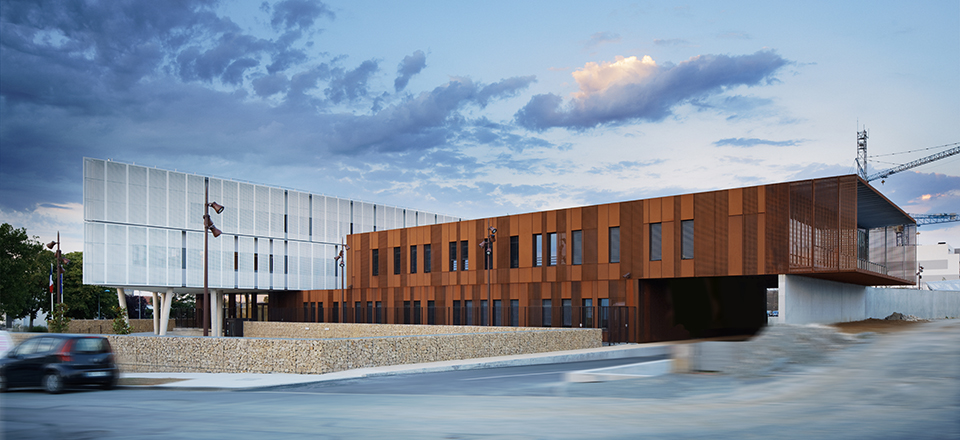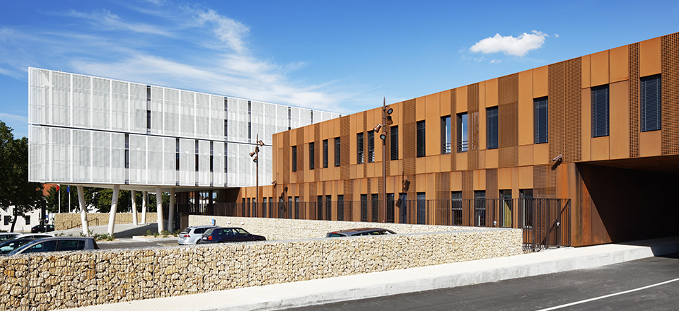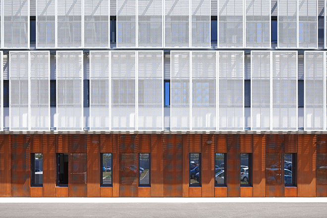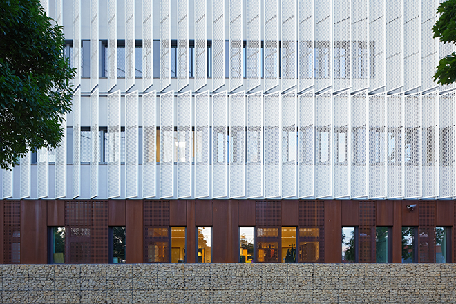 Le volume homogène, qui semble glisser au-dessus du soubassement, enveloppé d’une résille métallique constituée de panneaux perforés, souligne le caractère contemporain de l’édifice et en assure la sécurité comme la protection solaire. |