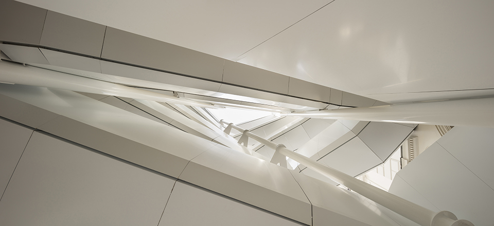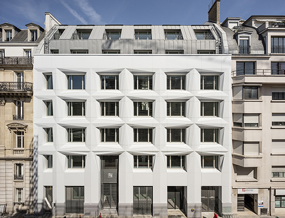 L'agence a souhaité valoriser et faire vivre la façade de l’immeuble rue de Londres en lui donnant un aspect tridimensionnel et sculpté, elle a donc imaginé un revêtement aux formes géométriques inspirées de l'Origami, l'art japonais du pliage du papier.