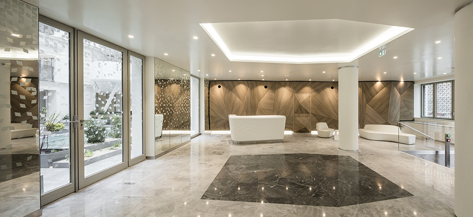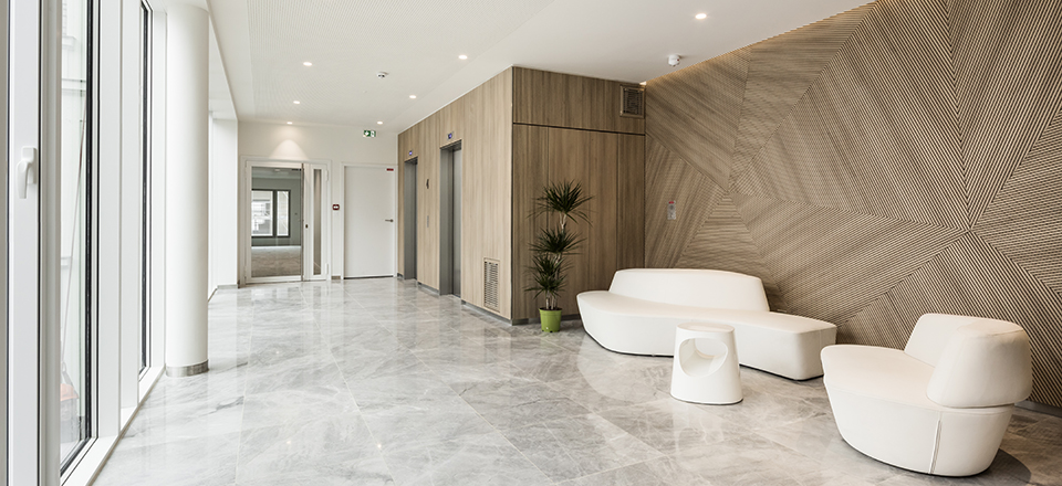 L’aménagement des espaces intérieurs a été repensé pour répondre aux nouveaux modes de travail qui allient confort, esthétique et performance pour les utilisateurs. Les matériaux (verre, Corian® et bois), les finitions, les couleurs et le mobilier sont en harmonie avec l’esprit ergonomique et écologique du lieu, en particulier dans le vaste hall d'accueil, imaginé par l'architecte d'intérieur et designer Zsofia Varnagy, dans lequel le bois utilisé pour le revêtement mural a aussi une fonction acoustique.