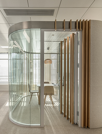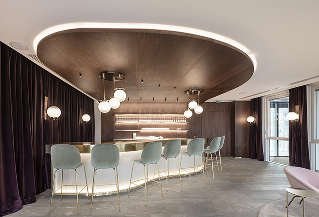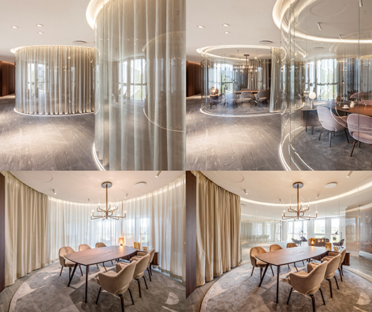 La Client Suite, formée de salles de réception dédiées aux rendez-vous et déjeuner d’affaires intégrant les meilleurs outils professionnels de communication dans un cadre feutré. La volonté était de créer un espace haut de gamme tout en finesse et particulièrement confortable. Les salles de réception en double peau de verre courbe créées un écrin recevant un voilage aux effets métallisés. L’association de ces matériaux permet d’offrir des jeux de lumière naturelle et artificielle. Un salon bar vient compléter l’espace dans la continuité architecturale de la Client Suite et offrant les services dignes d’un hôtel de luxe parisien.