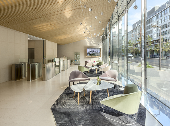 La phase 1 de notre mission consistait en l’aménagement des espaces nobles dont la Client Suite, l’espace commun, l’auditorium et la décoration du hall d’entrée.
