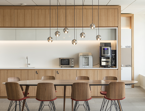 L’espace commun, traité tel le prolongement du patio avec des couleurs fraiches et acidulées, celui-ci accueille les collaborateurs pour un moment de détente autour d’un café, des réunions informelles et des événements liés à la vie de l’entreprise. Réalisés en formes ovoïdes, les deux grands ensembles qui se déplient en sycomore clair permettent d’offrir une conciergerie, un service de collations, un espace de préparation, des étagères et tables hautes et une salle polyvalente.