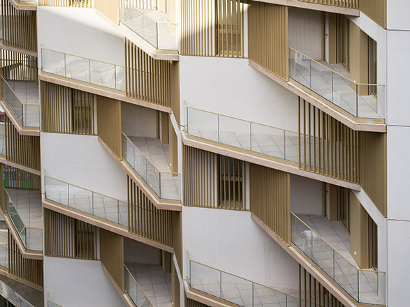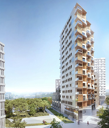 Cette polyphonie architecturale de 122 logements se décline entre accession et intermédiaire selon trois accords distincts : des maisons de ville de trois étages, un bâtiment de sept étages et une tour de 15 étages, soit 50 mètres qui s’érigent comme le mât d’un navire.