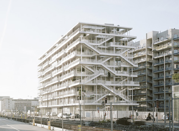 Ainsi, l’immeuble est situé au coeur d’un îlot de verdure, les terrasses sont équipées de jardinières mais également connectées pour se transformer en stations de travail ou en salles de réunion informelles. Les façades transparentes laissent entrer la lumière, tandis que les débords des terrasses permettent une protection solaire en formant un écrin climatique.