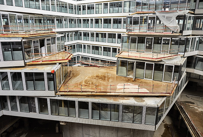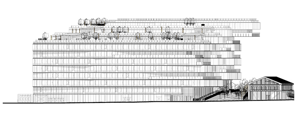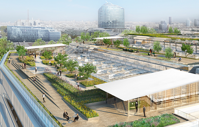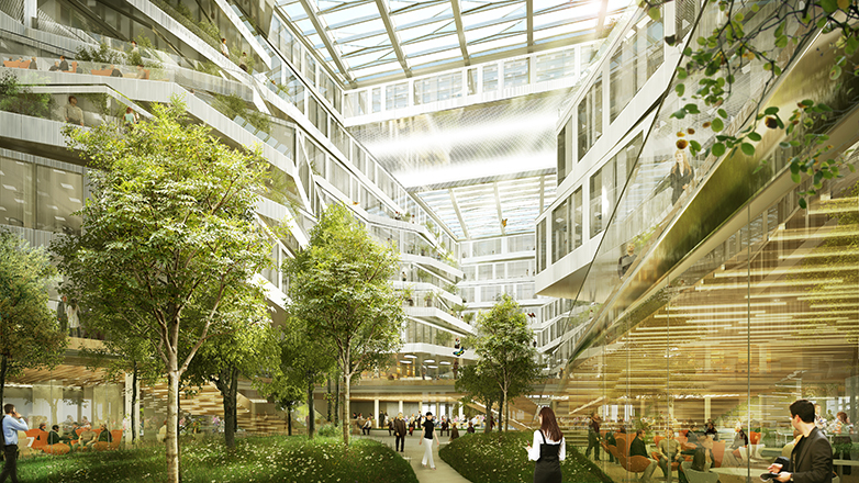 Il plonge le visiteur dans une "ville intérieure" aux multiples volumes suspendus. Au-dessus, les plateaux de bureaux sont prolongés par des balcons plantés et deux niveaux de jardins accessibles en toiture terrasse.