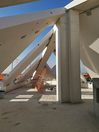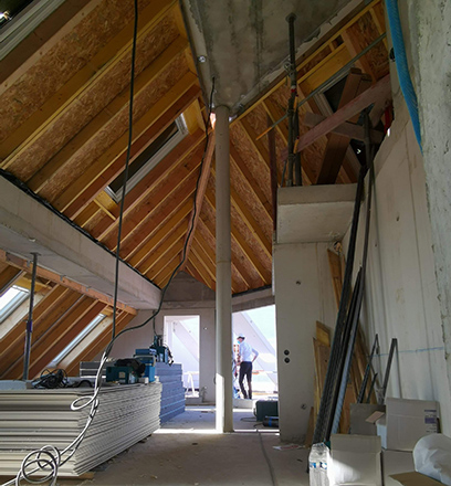 Le confort d’été a été particulièrement réfléchi avec la mise en œuvre d’une toiture en bardage métallique sur charpente bois recouverte ponctuellement de panneaux préfabriqués en béton permettant de diminuer les apports solaires sur la couverture.