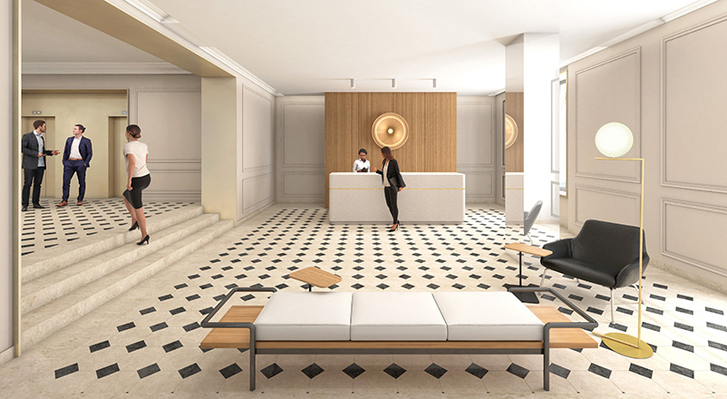 La rénovation a permis de réintroduire des matériaux nobles : parquet en point de Hongrie pour les espaces patrimoniaux, les paliers et les escaliers neufs, pierre de taille pour les escaliers historiques. Le hall sera quant à lui revêtu d’un sol géométrique en pierre de Bourgogne à cabochons, qui reprend un motif classique noir et blanc.
