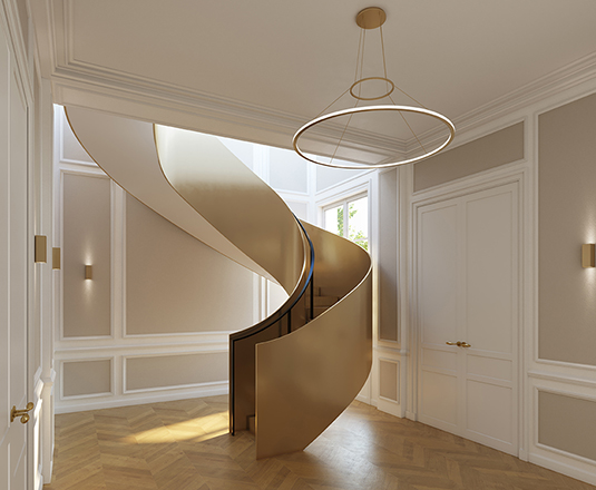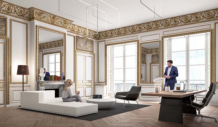 Les deux escaliers historiques conduisant aux anciens niveaux nobles, et les salons patrimoniaux présentant des décors et des volumes remarquables, sont rénovés dans l’esprit d’origine.
