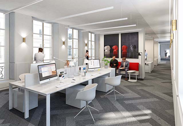 Les bureaux ont été repensés avec un standard élevé, répondant aux exigences internationales et aux nouveaux modes de travail. Exclusivement en premier jour pour offrir un confort de lumière naturelle aux usagers, les espaces de travail s’organisent autour de la cour d’honneur de 500 m², offrant un agrément unique en plein Paris. Les plateaux courant de 1 000 m² ont été optimisés pour disposer d’une hauteur sous plafond exceptionnelle et à chaque étage, des espaces spécifiques accueillent des salles de réunion. |