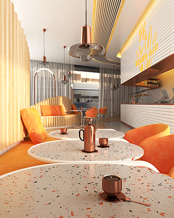 A la verticale, le réseau ferroviaire attenant à la rue Perrotin a également servi de source d’inspiration. Regarder les rails du dessus, à vol d’oiseau, nous permet d’en extraire un tableau en mouvement. Comme une fresque cinétique, les verticales se déplacent, parfois de bas en haut, et d’autres fois, de haut en bas. Le projet de GRAND AIR réinjecte ce mouvement vertical dans la conception de ses épines dorées présentes en façade.