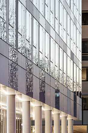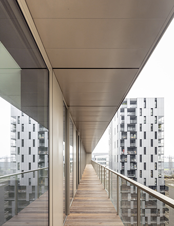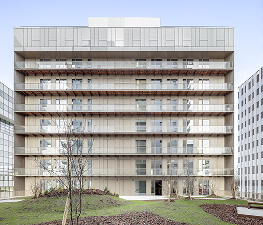 Les deux opérations, bureaux et logements, sont posées sur un socle unis par une même matérialité : des panneaux métalliques de couleur bronze. Sur le socle, un jardin suspendu relie le bâtiment tertiaire à l’immeuble de logements.