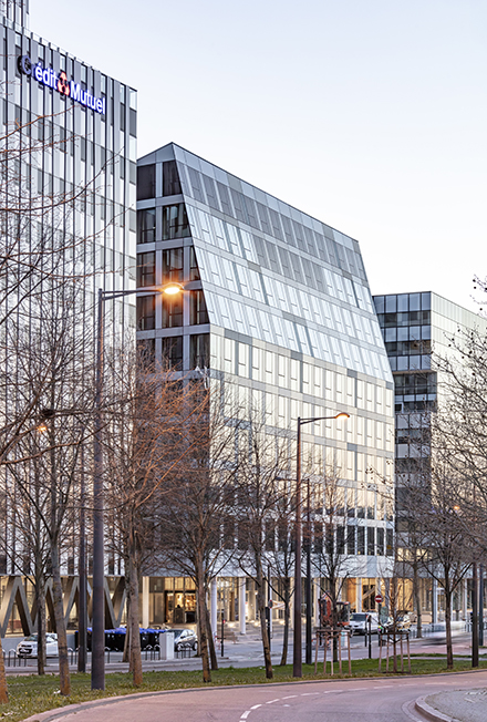 L’alignement du front bâti respecte la rigueur de la composition urbaine tandis que les formes prismatiques apportent une respiration dans la ligne de ciel.