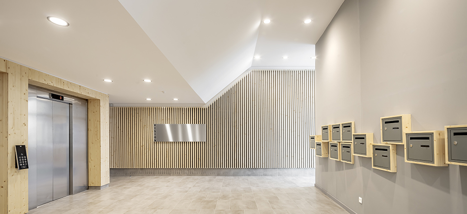 La trame s’exprime par différentes textures de vitrages émaillés et un camaïeu d’ocres clairs. Côté commerces et boulevard, les façades sont lisses et monolithiques. Face aux logements, traités de manière plus intimiste, la modénature se prolonge par des espaces extérieurs.
