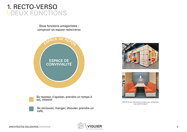 Dans le cadre de son engagement avec l'association Architectes Solidaires, VIGUIER architecture / urbaniste / paysage, présente le projet de rénovation de deux salles de repos au CHU Avicenne à Bobigny (93).