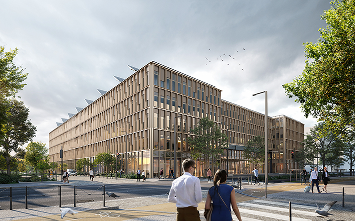 L’architecture du bâtiment est pensée de façon à créer une transparence et une perméabilité de l’îlot, entre façades vitrées et remplissage ajouré. L’usage du bois est prédominant sur l’ensemble du bâtiment. La structure béton devient une structure bois à partir du 2è étage. L’atrium central est traité en bois dans son intégralité. Les matériaux de la façade seront traités dans des tons chaud rappelant le bois.